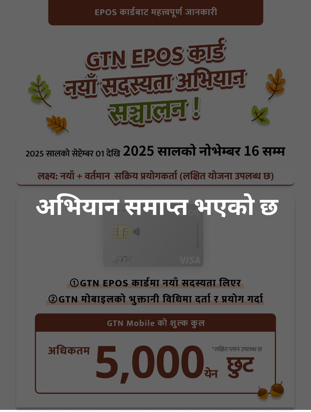 *यदि 2025 नोभेम्बर 30 भित्र GTN Mobile को भुक्तानी विधिमा कार्ड नम्बर दर्ता गरिएको छैन भने, अधिकतम ¥5,000 छुट प्राप्त नहुन सक्छ।