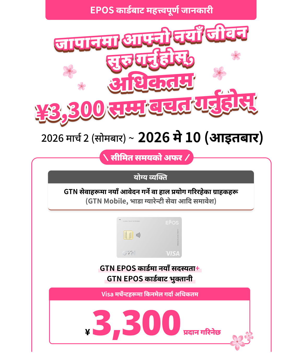 EPOS कार्ड प्रयोग रकमबाट अधिकतम ¥3,300 स्वतः छुट प्रदान गरिनेछ।