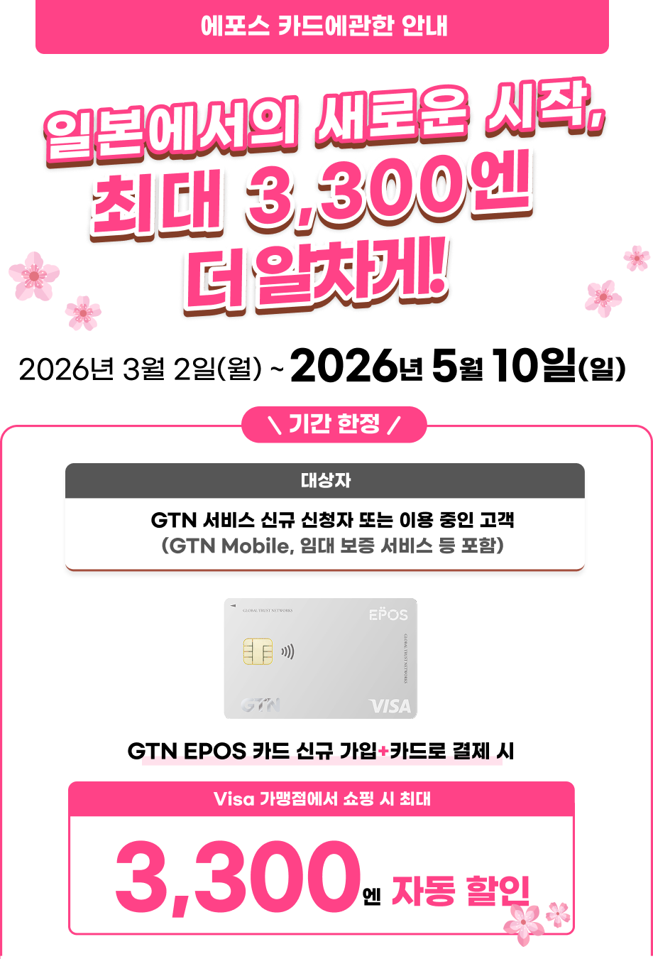 카드 가입 다음 달 말일까지, EPOS 카드 이용 금액에서 최대 3,300엔 할인이 적용됩니다.