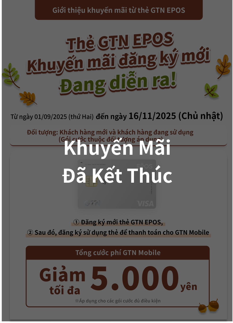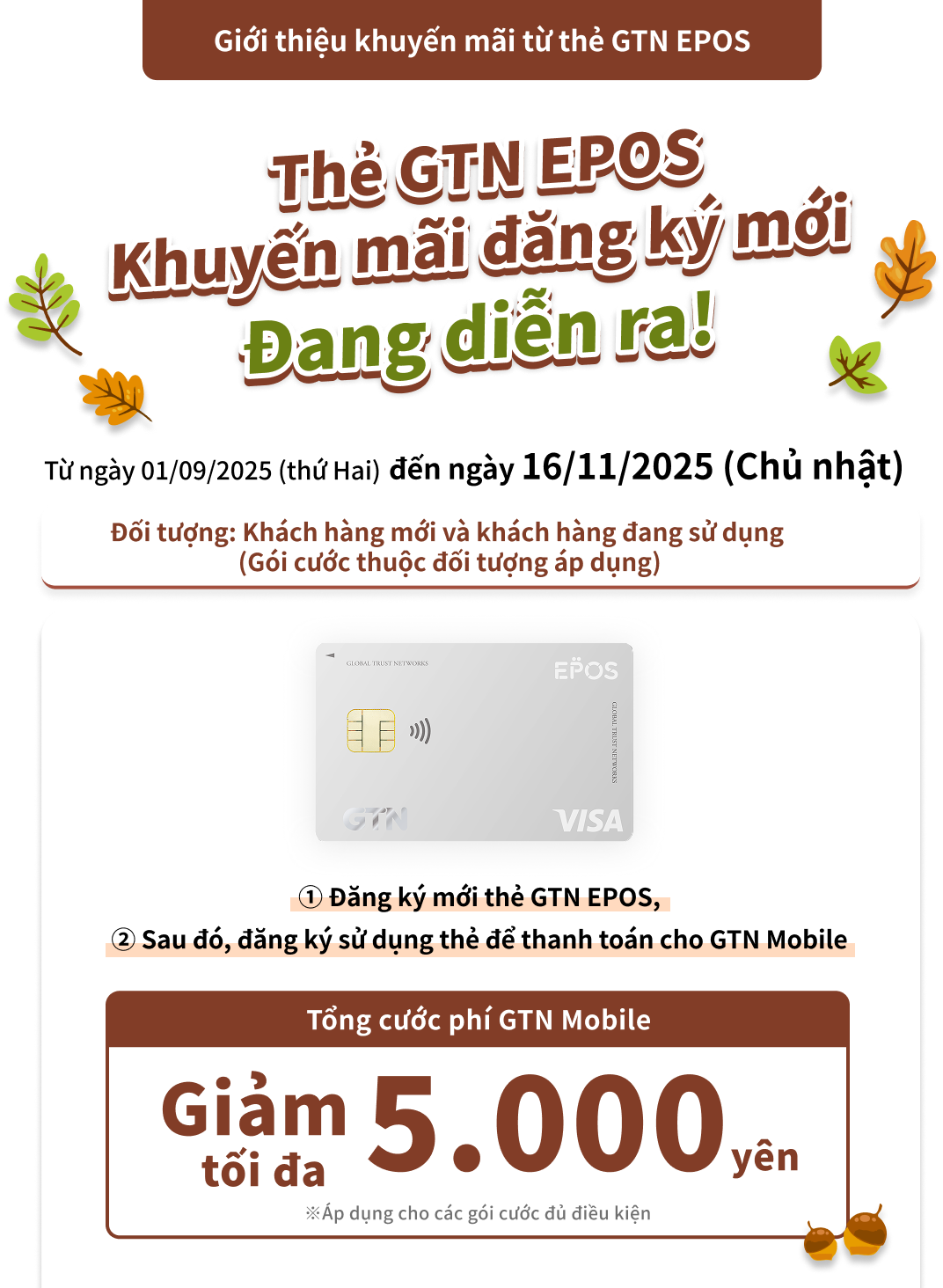 *Nếu bạn không hoàn tất đăng ký số thẻ vào phương thức thanh toán của GTN Mobile trước ngày 30/11/2025, tổng số tiền giảm giá tối đa 5,000 yên có thể sẽ không được áp dụng đầy đủ.