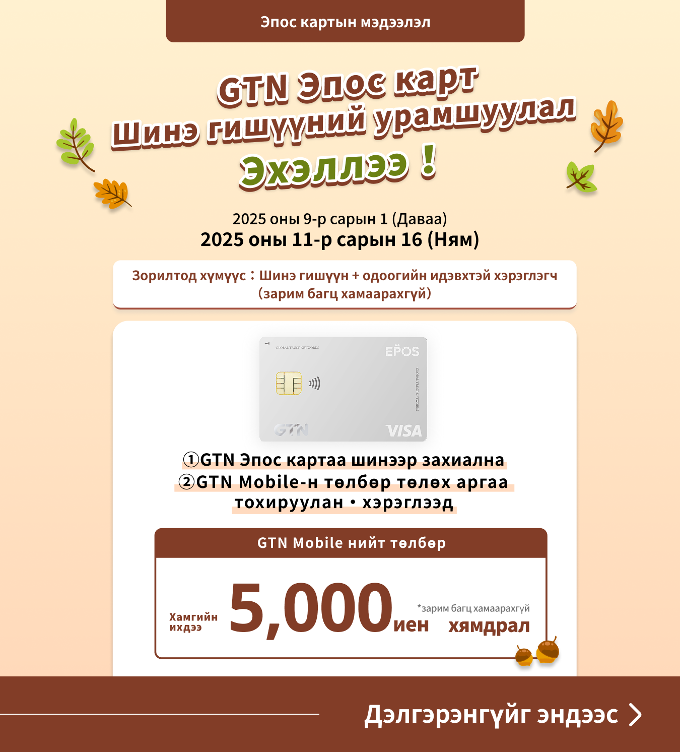 ・Эпос Visa урьдчилсан төлбөрт картад цэнэглэн, Visa-гийн хамтрагч дэлгүүрүүдэд ашиглахGTN Эпос карт нь санаа зоволтгүйгээр ашиглах боломжтой олон төрлийн үйлчилгээг агуулдаг.